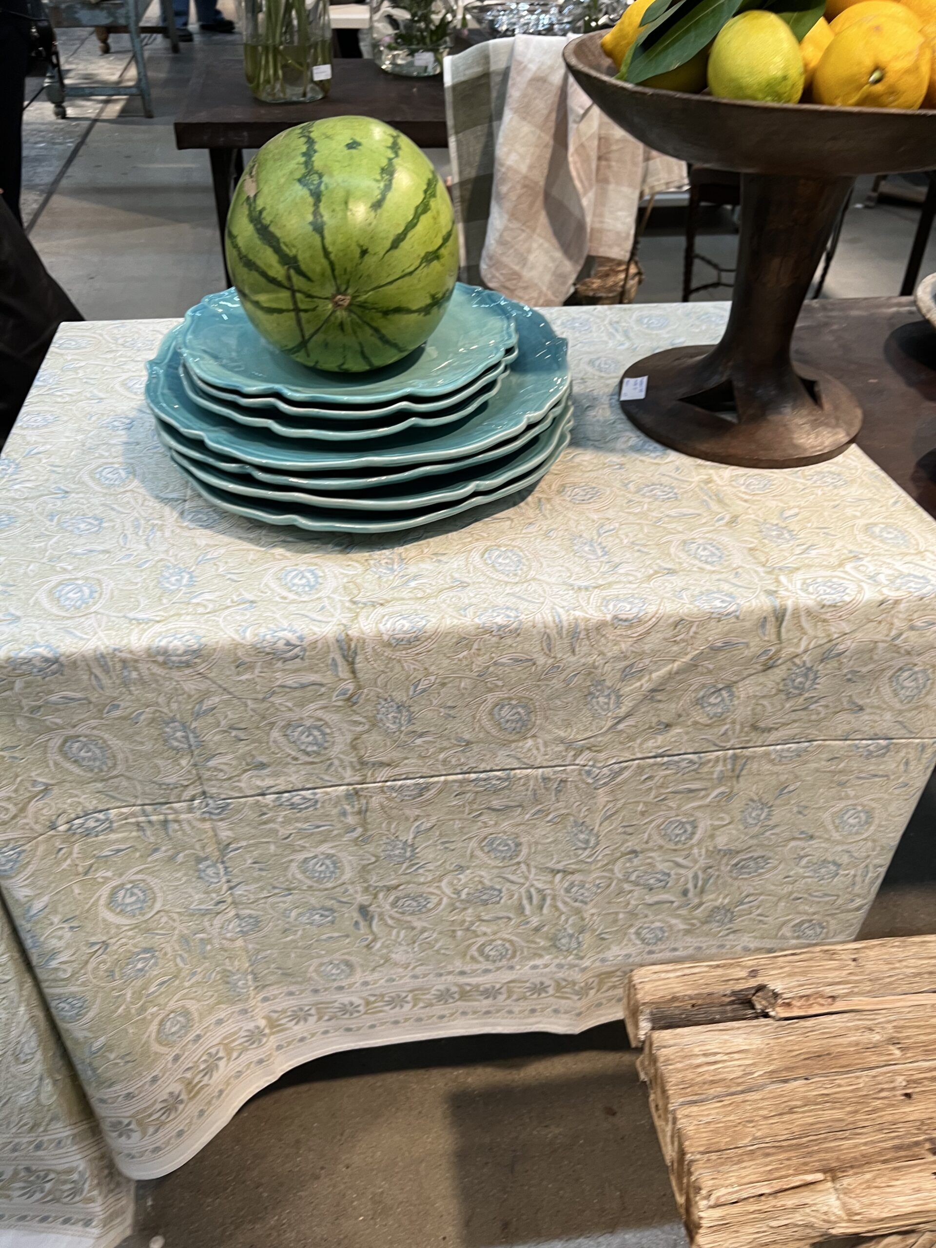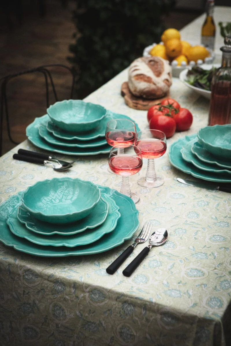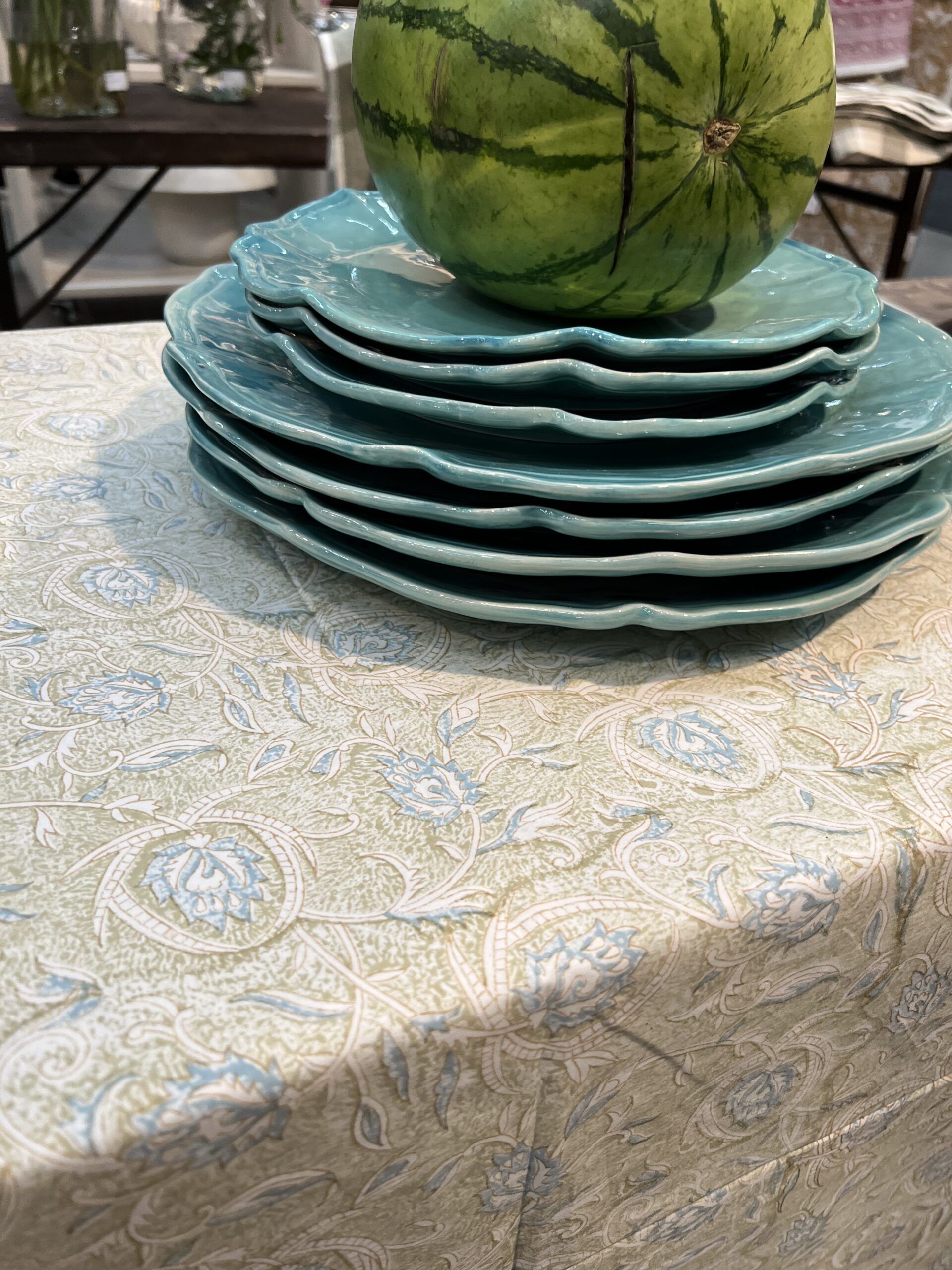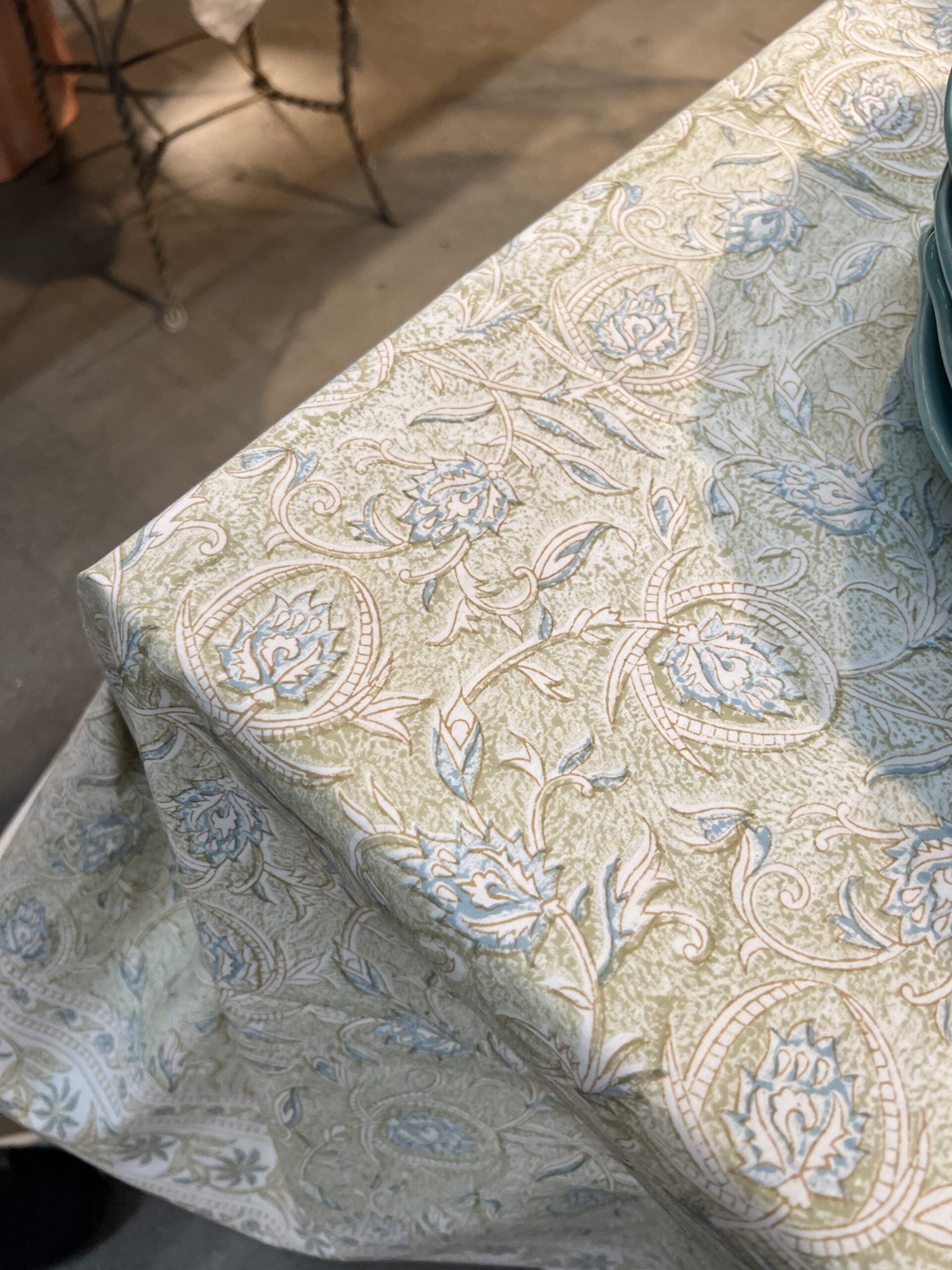 Bordsduk Muro grön blå 220 x 150 cm. Vacker bordsduk i mönstrade milda grön-blåa toner. Duken har även en fin bård runt om.