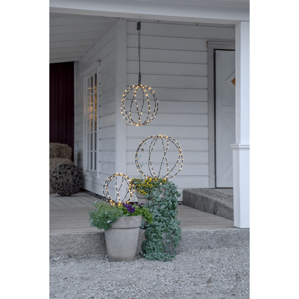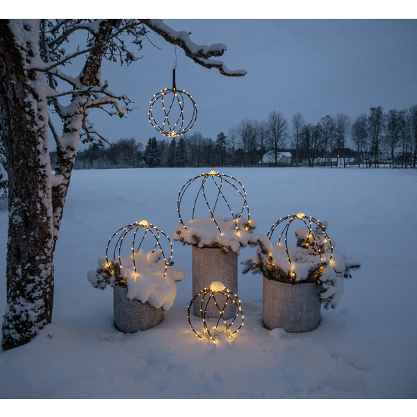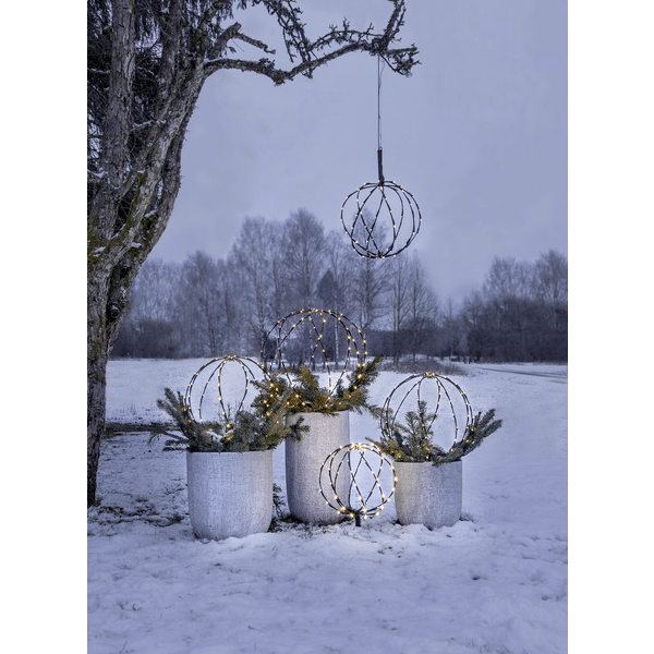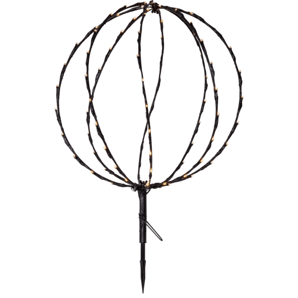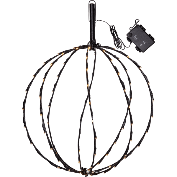 Klot utomhusdekoration Sphere 40 cm LED. Dekorativt svart klot med 88 varmvita ljuspunkter, 40cm i diameter med timerfunktion. Ger ett härligt ljus till din trädgård. Produkten kan användas som både hängande och stående, markspettet är avtagbart och det finns en krok för upphäng, för att inte belasta kabeln använd en kedja eller rep att hänga klotet i. Batteribox för utomhusbruk. Klotet är ihopvikbart vilket sparar utrymme när den inte används. Förboka nu. Kommer snart i lager.