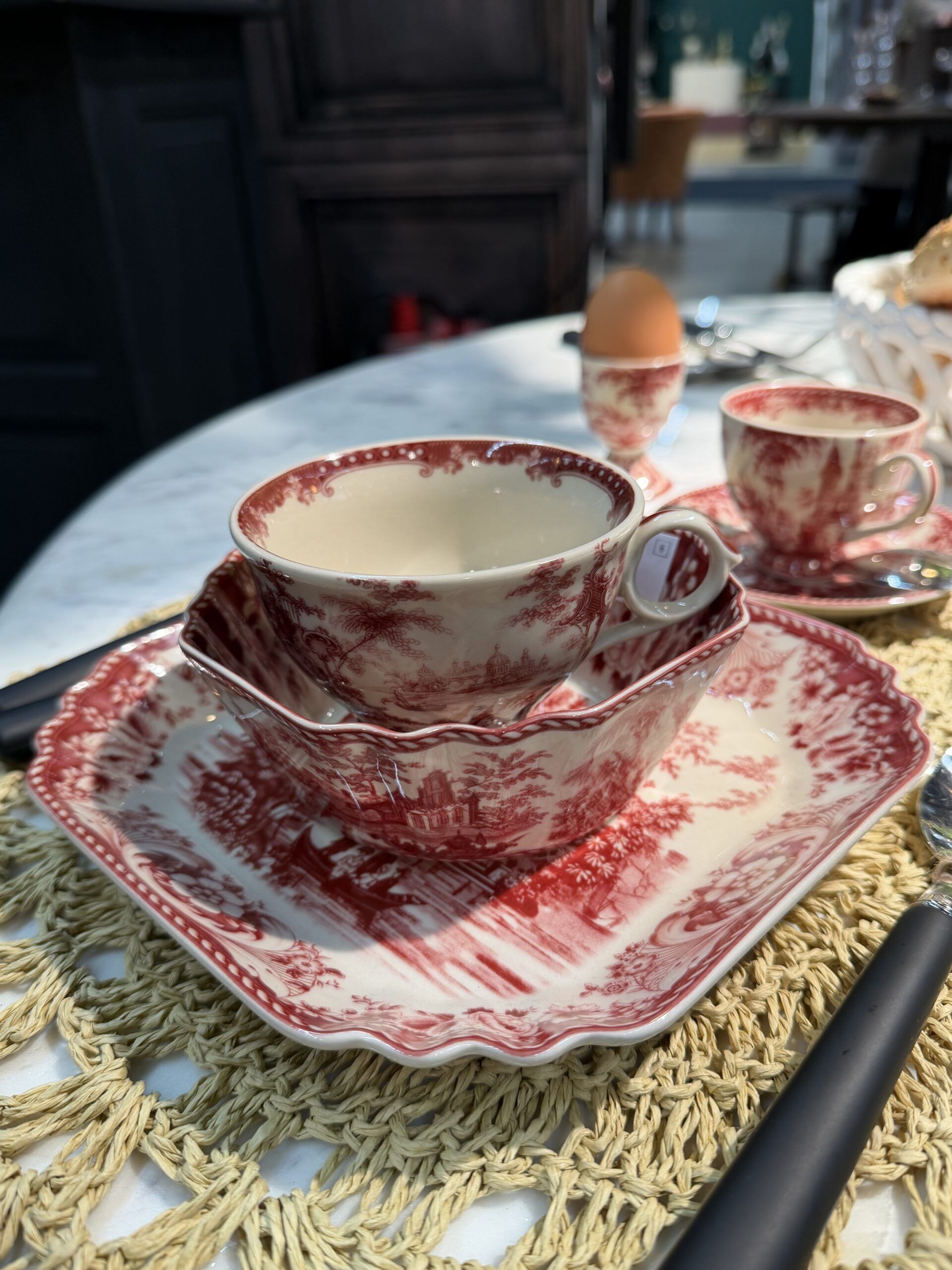 Kopp Estelle röd. Vacker kopp i vintage look inspirerad av 1700-talets Frankrike och Toile de Jouy. Den vackra 1700-talsdesignen kännetecknas av detaljerade landskap och romantiska motiv i en enda färg. Estelle förenar historia och elegans med en modern twist – och är den perfekta koppen för en stillsam eftermiddagsfika. Serie som finns i flera delar och i tre färger. Ett trendigt måste i varje hem.