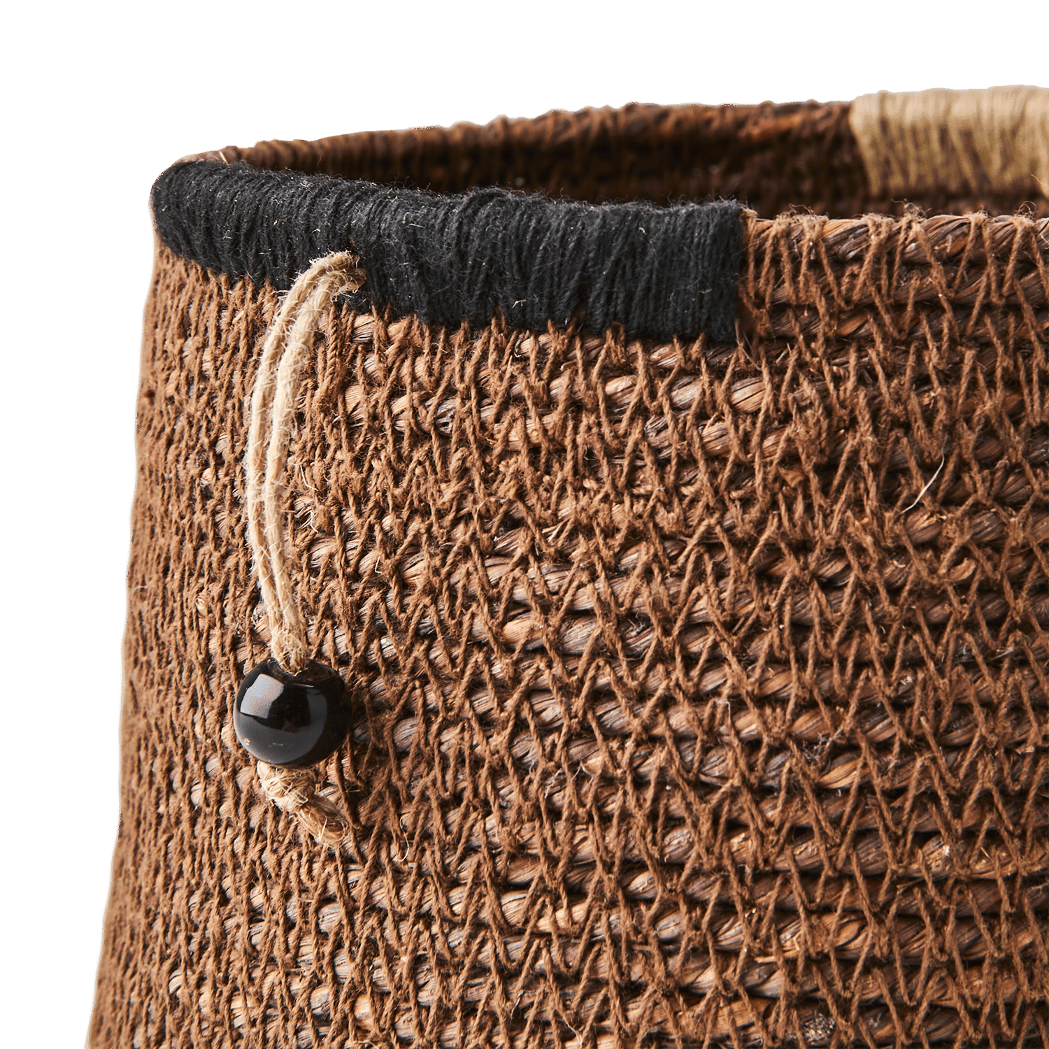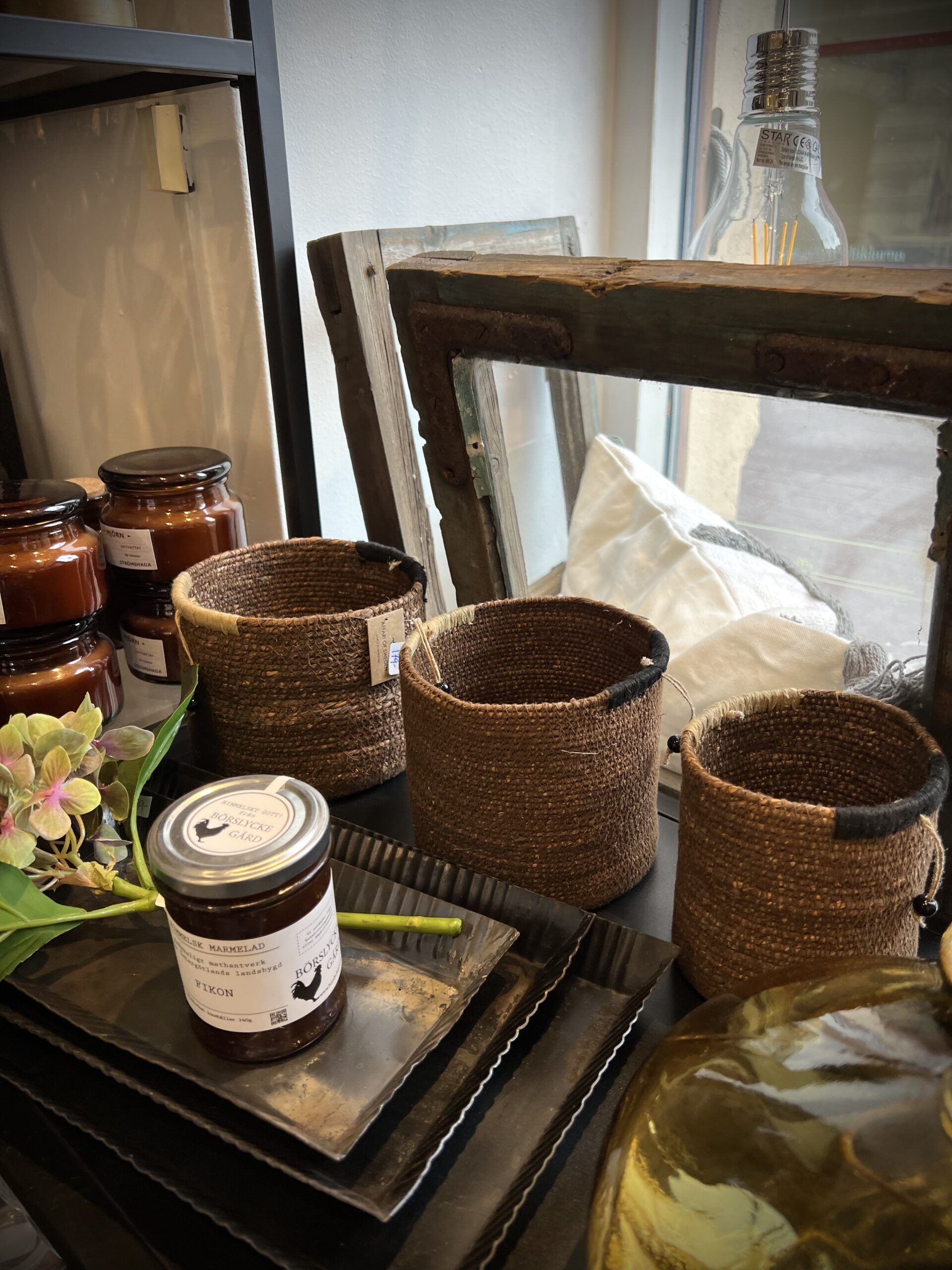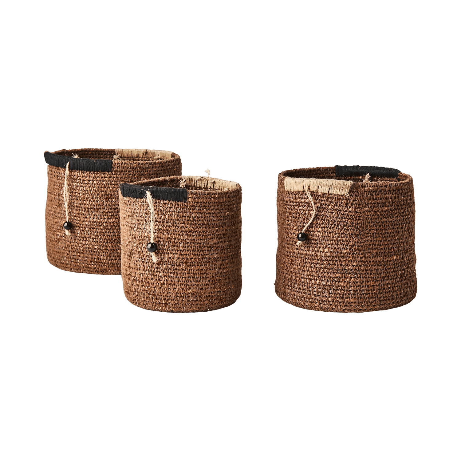 Korg Madiba brun. Handsydda korgar i brunt. Finns i tre olika storlekar. Form och storlek kan variera något. Passar bra till småsaker, pennor, som blomkruka om du skyddar den med plast.