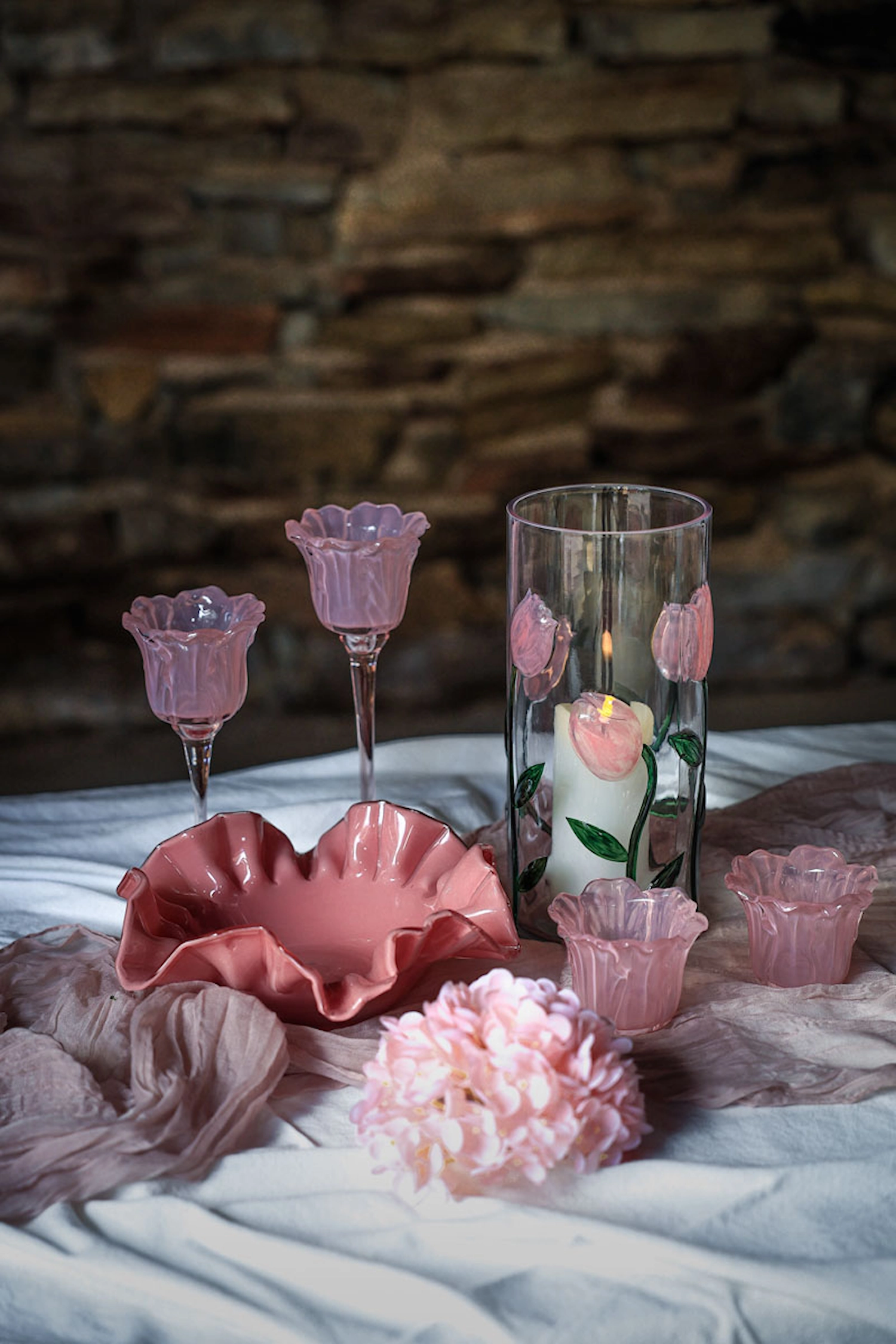 Ljuslykta Blomma rosa. Vacker glaslykta i färgad beige nyans. Lyktan är inspirerad i formen av blomblad. Skapar stämning och en fin dekoration på bordet. Finns även i beige – Ljunga.