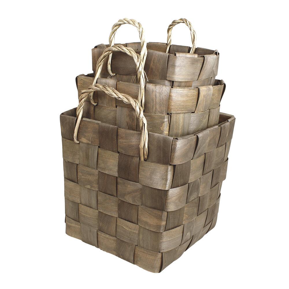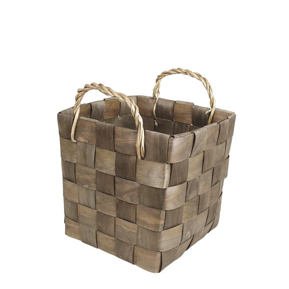 Spånkorg gråbrun stor. Snygg spånkorg i snygg gråbrun färg med tvinnade handtag. Tillverkade av mandaringran (cunninghamia lanceolata), en cypressväxtart. Finns i tre storlekar.